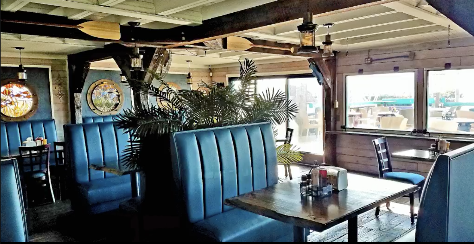 Hidden Treasures Rum Bar & Grill, located in Ponce Inlet, FL, has been around for over 35 years. The original dining room was entirely pine from top to bottom. It truly was a blank slate, a space that was not being utilized to its maximum capacity. We took on the challenge to maximize the dining area because we understand that more seats mean greater profit opportunity. Now, by doubling the seating capacity while keeping traffic flow areas efficient, they were ready to improve the atmosphere. A pop of white and blue color tones emphasizes the view of the Halifax River. Being right on the water, it had to have that beach feel without the typical "beachy" look. Our vision was a nautical theme, and that's where we started, building it out with a little imagination. Every space must tell a story, and this one was about 'sailing on an old ship in the open waters, looking out of the portholes as the lantern lights sway above you.' The dining room is a bright space for those dark and gloomy stormy days, as well as for the sunny daytime afternoons. There are swing-in windows with a long counter bar where you can sit and watch the water move while you travel amongst the oceans. We were able to achieve that, and more!