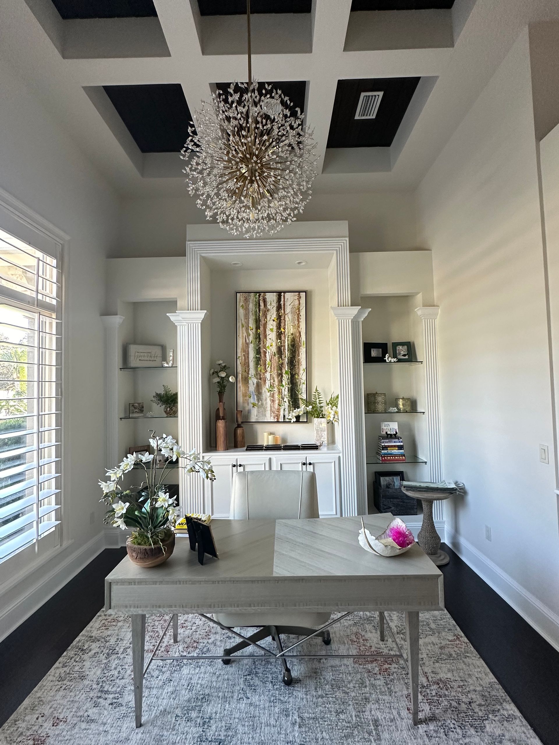 Our clients moved from Atlanta to Florida and wanted to have their custom-built home open and airy. Normally a foyer is adorned with heavy furnishing and elaborate accessory pieces. By discussing their ultimate goal for the foyer with our clients we decided to make it a space that lets you leave your worries behind you as you enter the home. The sofa table almost disappears, and you notice the beautiful piece of art that hangs above it, the delicate chandelier made of seashells reminding you it's time to decompress and enjoy the moment.