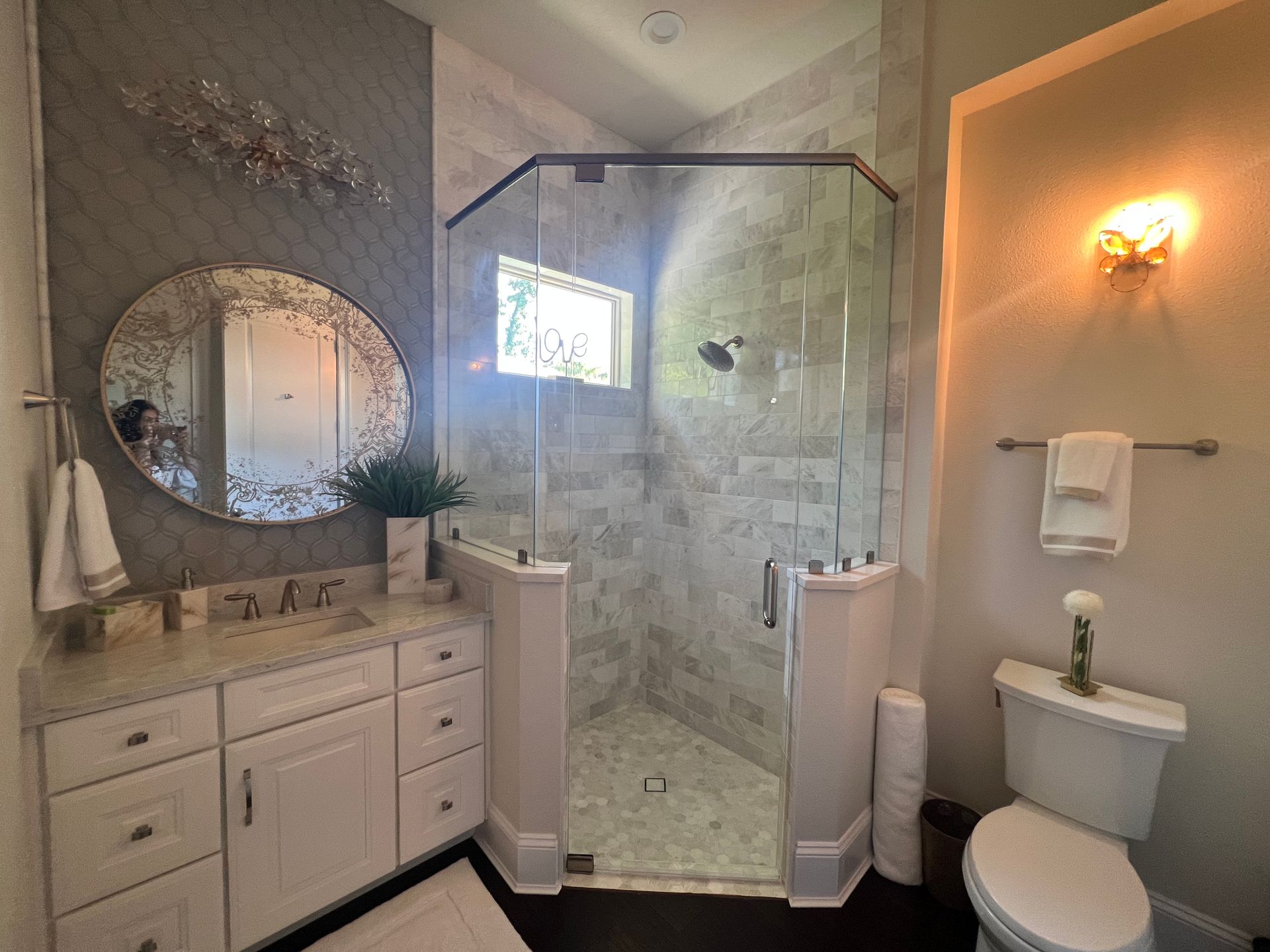 At the heart of this design is a wet room shower and tub combo, offering a seamless and indulgent bathing experience. Our client's desire for luxury guided our selection of high-end fixtures, premium materials, and thoughtful amenities.